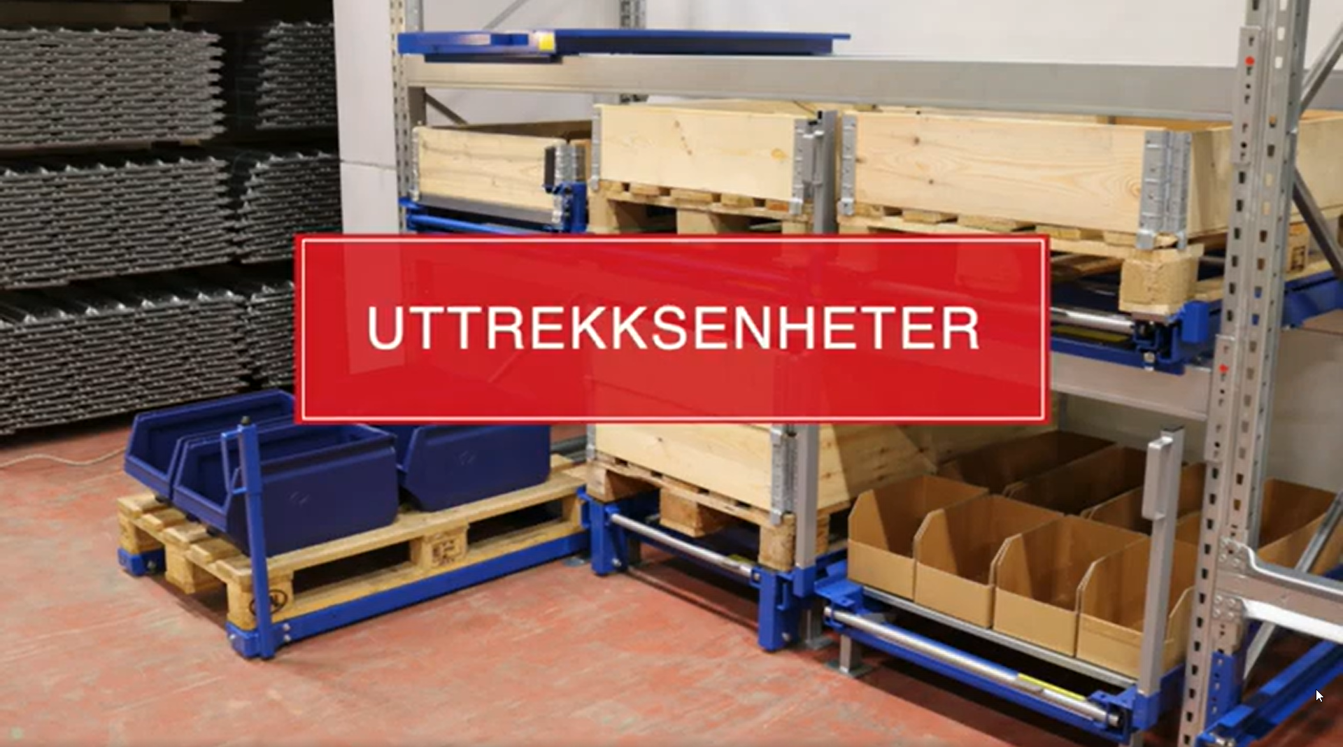 Uttrekksenhetene kan tilpasses etter godstype og kompletteres med praktiske og funksjonelle tilbehør. I tillegg til enheter for palleoppbevaring, kan vi også tilby spesialenheter for tungt og volumiøst gods som ikke kan oppbevares på pall, f.eks. rør, plater, tunge formverktøy mm.